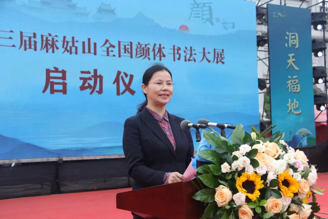 顏萍代表縣委、縣政府和全縣人民向各位書法家和各位嘉賓的到來表示熱烈歡迎,向第三屆麻姑山全國顏體書法大展的舉辦表示熱烈祝賀!